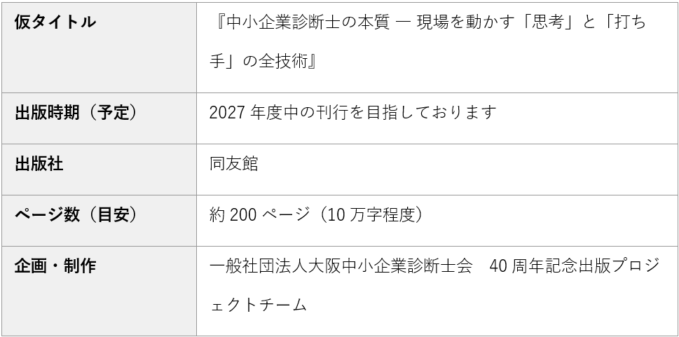 一般社団法人大阪中小企業診断士会(以下「当会」)は、2025年度に迎えた設立40周年を記念し、出版プロジェクトを正式に発足いたしました。