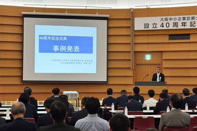 さらに、会員による成果報告では、 柳⾠雄 診断士と⽯橋研⼀ 診断士により地域企業への支援事例や新たな取り組みが紹介され、当会が積み重ねてきた歩みと未来へ向けた力強い意志が示されました。また、当日は大阪府知事はじめ多くの方より祝電も届き、会全体の大きな励みとなりました。