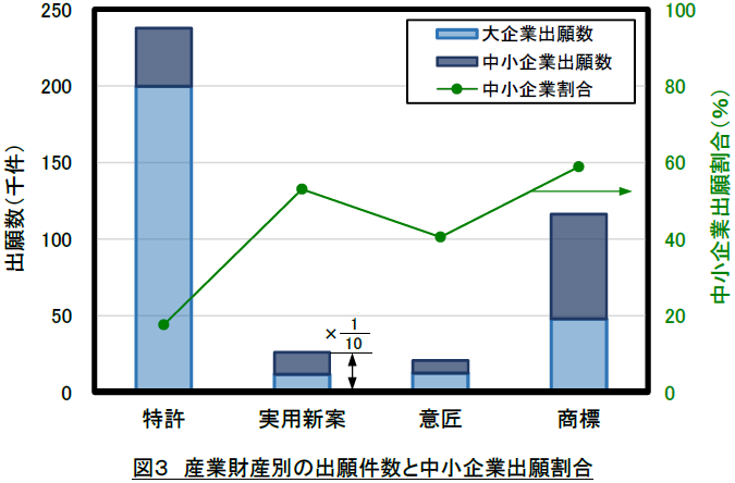 産業財産権毎の中小企業・大企業の出願数と中小企業出願割合を、図3(補足3)に示します。なお、実用新案の出願数は少ないため、10倍して図示しました(図中の高さの1/10が実際の出願数)。