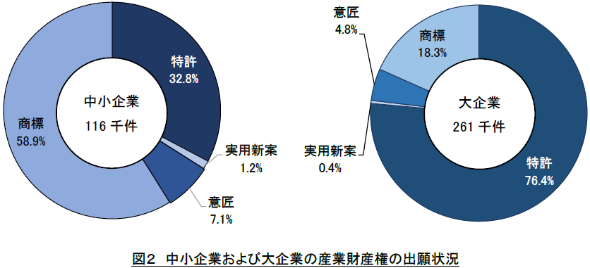 中小企業および大企業の産業財産権(特許権、実用新案権、意匠権、商標権)の出願状況を、図2(補足3)に示します。