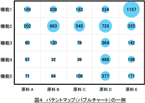 パテントマップの例を図4(著者作成)に示します。図4では、ある特許群について、製品の機能、原料、及びこれらの特許件数をバブルチャートで可視化しました。図中の円(バブル)が特許件数の応じて大きくなるため、特許出願の傾向が直感的に把握できます。
