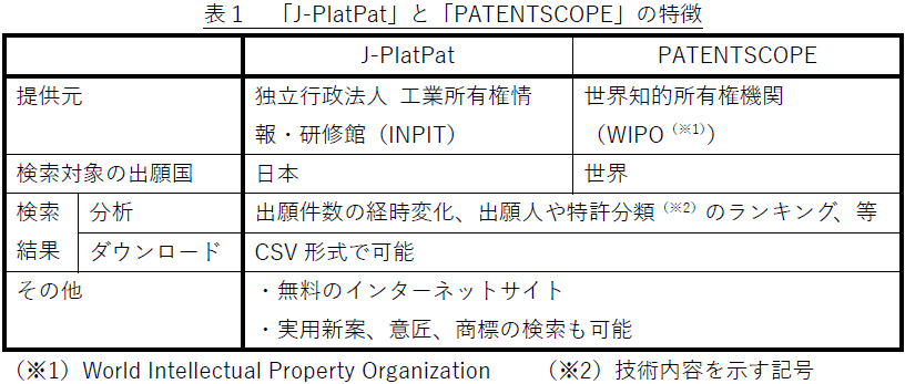 特許分析には、特許の検索が必要です。特許情報は公開されているため、何人もアクセスできます。特許の公的検索サイトとしては、「J-PlatPat」と「PATENTSCOPE」が知られています。両者の提供元等を表1に示します。