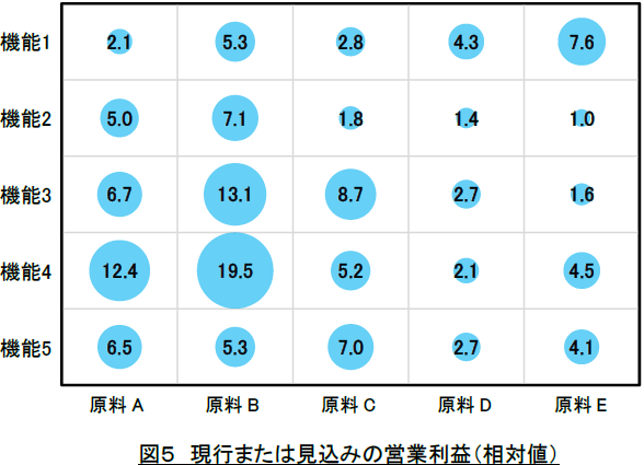 図4から、注力すべき原料・機能を経営的に判断する場合は、例えば、原料・機能の次のような要素を数値化し、売上や利益と関連付けます。